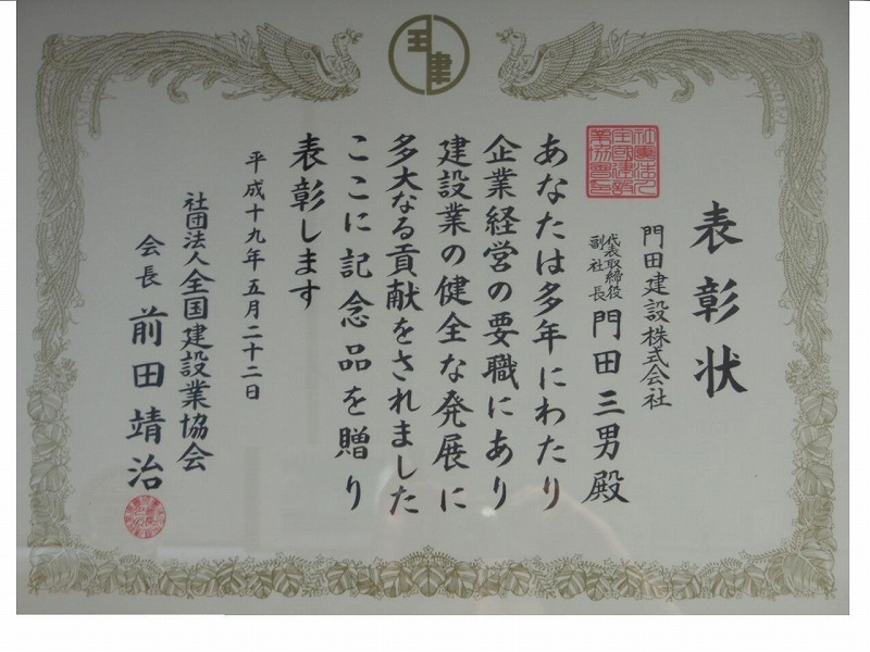 社団法人 全国建設業協会より表彰を受けました 2007年5月21日 最終更新日時 : 2007年5月21日 kdt-admin 社団法人 全国建設業協会より、当社の代表取締役会長 門田 三男が多年にわたり役員の要職にあり かつ建設業の健全な発展の為に尽力しその功績が認められ表彰を受けました。