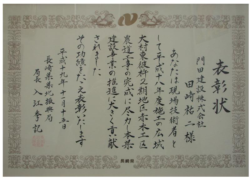 長崎県県北振興局 局長様より表彰を受けました。 2007年11月26日 最終更新日時 : 2007年11月26日 kdt-admin 平成18年度施工“広域大村東彼杵2期地区赤木工区農道工事”の優秀現場代理人として当社の田崎祐二が表彰を受けました。