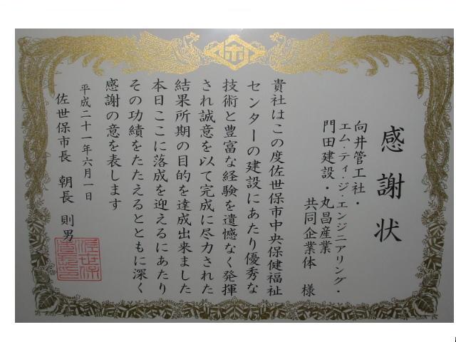 佐世保市長様より感謝状を頂きました。 2009年6月9日 最終更新日時 : 2009年6月9日 kdt-admin "すこやかプラザ"新築(機械設備)工事において無事故無災害で完工することが出来、落成式にて感謝状を頂きました。