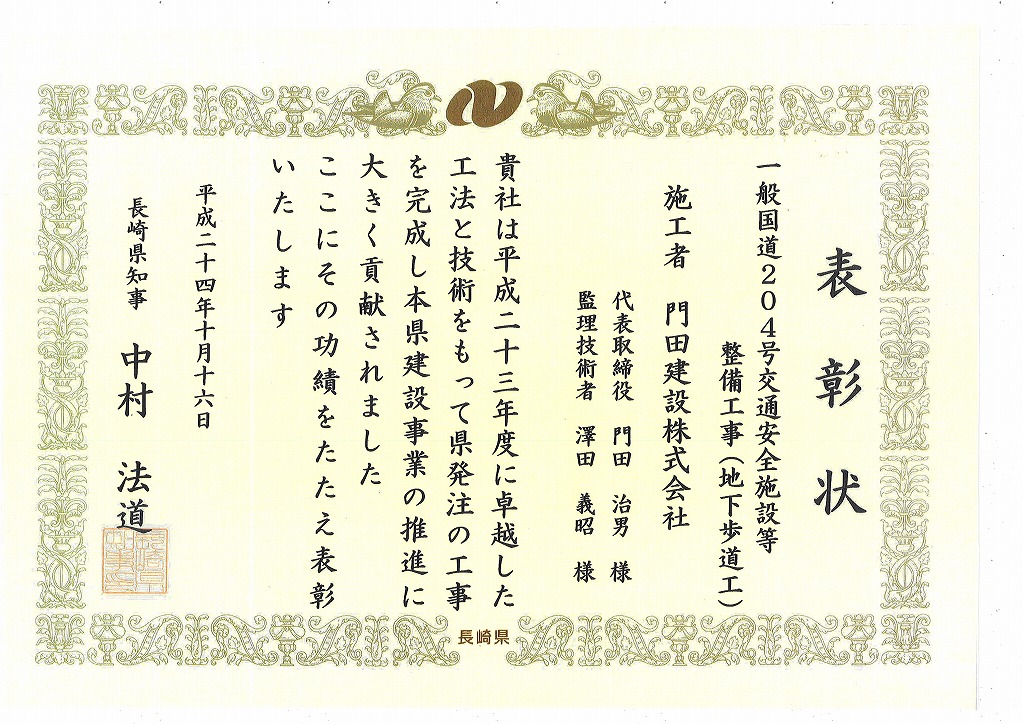 長崎県知事より表彰を受けました。 2012年10月16日 最終更新日時 : 2012年10月16日 kdt-admin H23年度施工 一般国道204号交通安全施設等整備工事(地下歩道工)において長崎県知事より表彰を受けました。