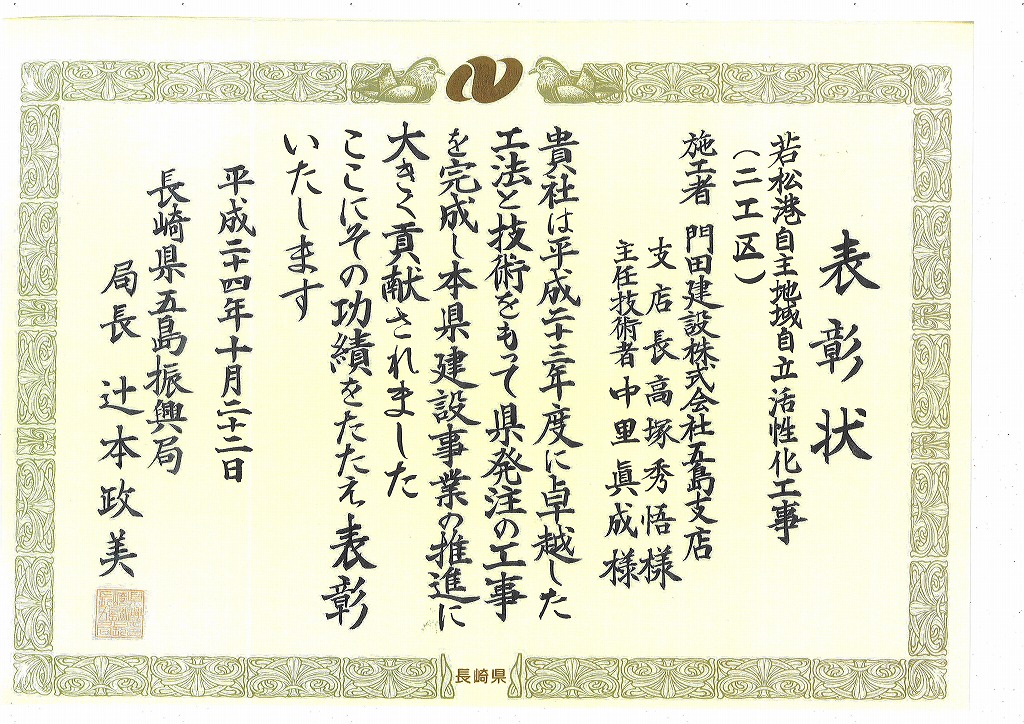 長崎県五島振興局より表彰を受けました。 2012年10月22日 最終更新日時 : 2012年10月22日 kdt-admin H23年度施工 若松港自主地域自立活性化工事(二工区)において、長崎県五島振興局より表彰を受けました。