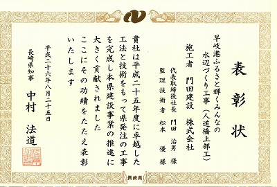長崎県知事より表彰を受けました。 2014年8月25日 最終更新日時 : 2014年8月25日 kdt-admin H25年度施工『早岐港ふるさと輝くみんなの水辺づくり工事(人道橋上部工)』において、長崎県知事より表彰を受けました!
