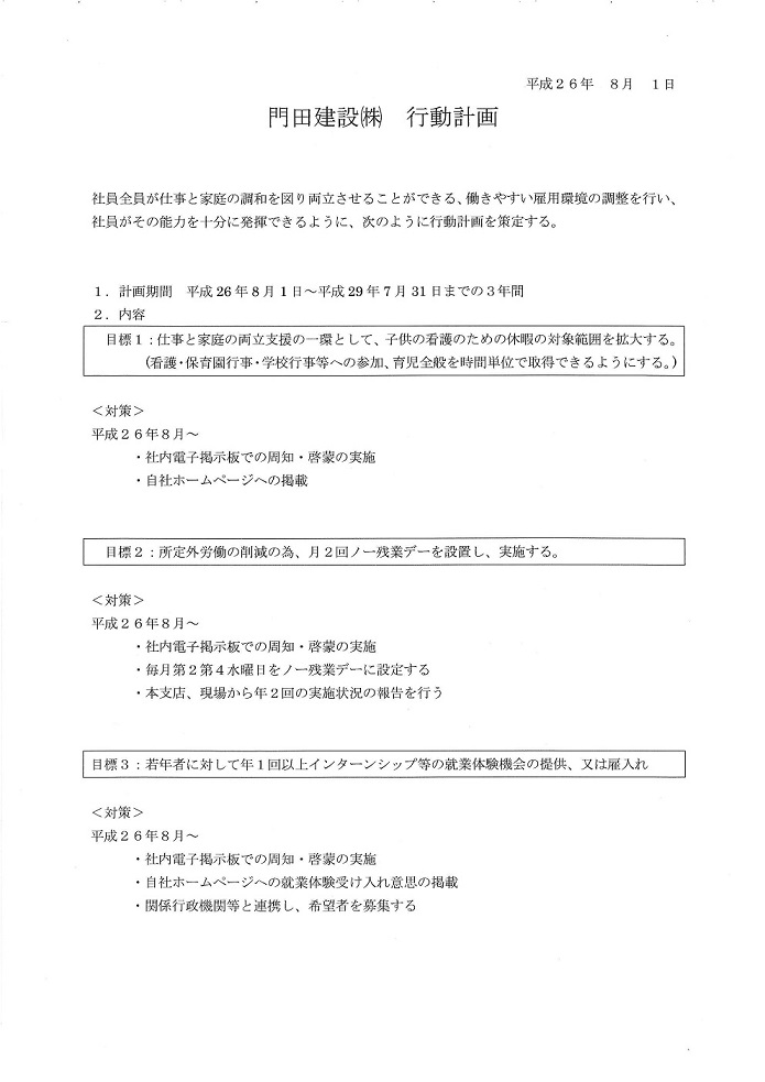 門田建設株式会社は、次世代育成支援対策推進法に基づき「一般事業主行動計画」を公表いたします。