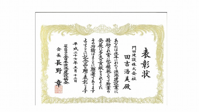 全日本漁港建設協会長より表彰を受けました! 2015年5月13日 最終更新日時 : 2015年5月13日 kdt-admin 永年に亘り漁港建設業に携わり、 多大なる貢献をしたことが評価され、当社の田吉浩美が 全日本漁港建設業協会長より表彰を受けました。
