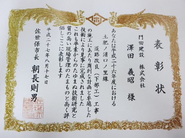 佐世保市長より表彰を受けました。 2015年8月17日 最終更新日時 : 2015年8月17日 kdt-admin 平成26年度施工『土肥ノ浦口ノ里線道路改良(下部工)工事』 において、佐世保市長より表彰を受けました!