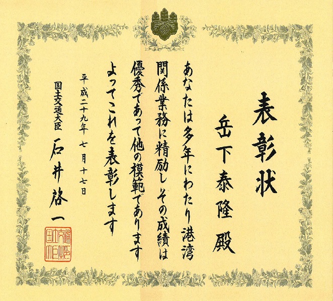 平成29年 海事関係功労表彰 2017年8月23日 最終更新日時 : 2017年8月23日 kdt-admin 7月17日に行われた海の日式典にて 当社の 工事部 岳下泰隆が 国土交通大臣より表彰を受けました!!