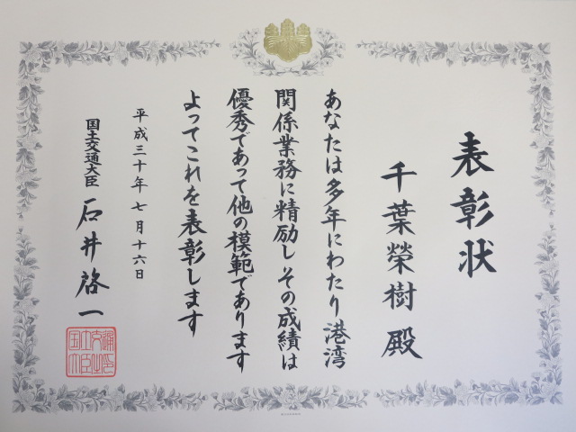 国土交通大臣より表彰を受けました! 2018年9月10日 最終更新日時 : 2018年9月10日 kdt-admin 多年に亘り、港湾関係事業に精励し、優秀な成績を残してきたことが讃えられ、当社の千葉栄樹が表彰を受けました。