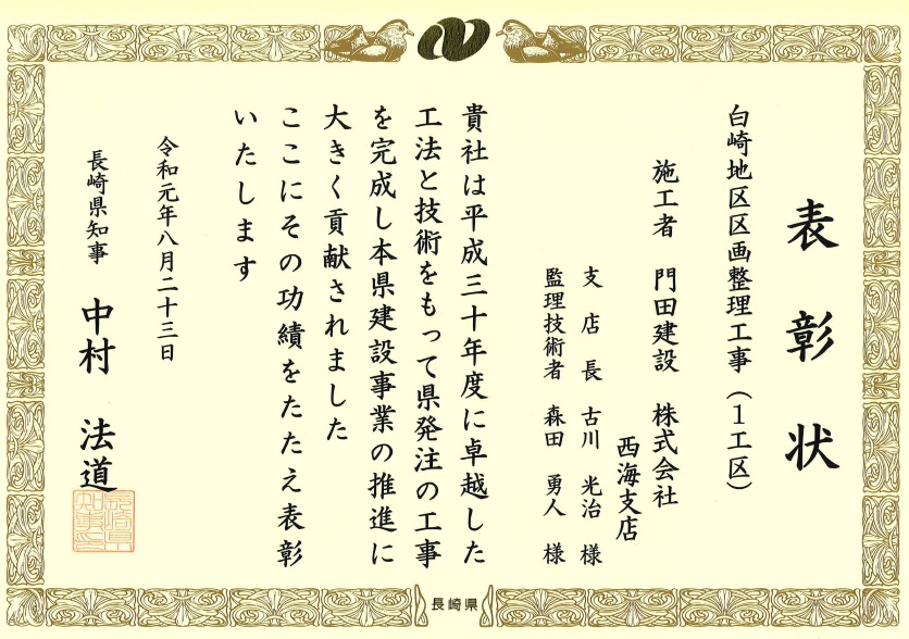 令和元年度 長崎県優秀工事知事表彰式 2019年8月23日 最終更新日時 : 2019年8月23日 kdt-admin 令和元年度 長崎県優秀工事知事表彰式が執り行われました。 当社からは 白崎地区区画整理工事(1工区)において 森田勇人が表彰されました。
