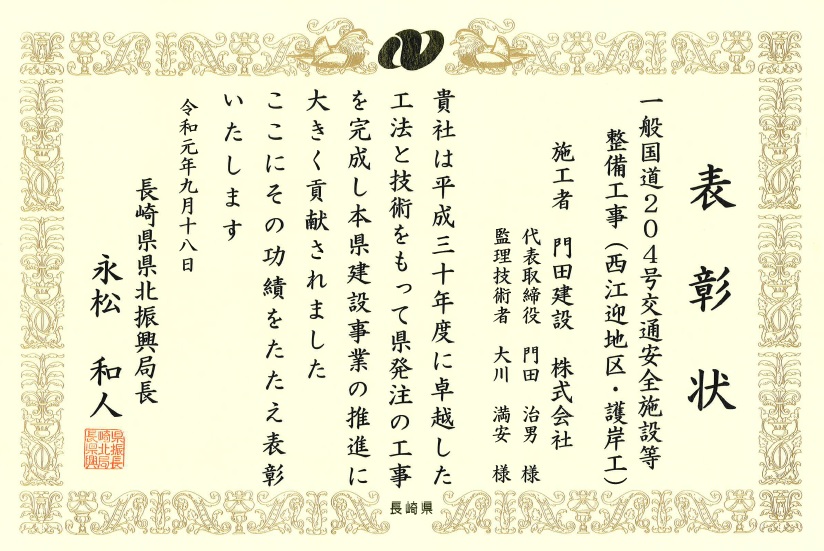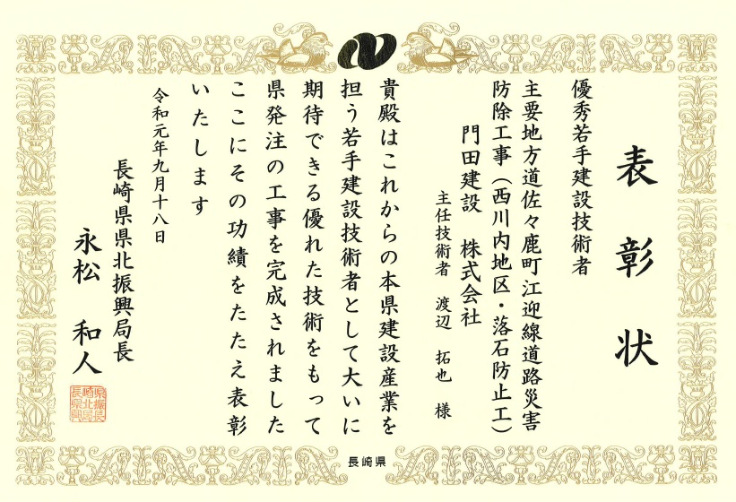 『優秀若手建設技術者表彰』(受賞者:渡辺拓也)